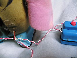 新しい配線をネジりながら、本体から少し出ているオリジナルの配線とハンダで繋げました。本当は、モーターに付いている、オリジナルの配線を全てはずす予定でしたが、配線がいくつもモータに付けてあったのと、古いモーターなので、ハンダの熱でやられるといけないので、あえて、古い配線を残し、途中接続をする事にしました。ハンダ付けをした所は、むき出しになるので、同色のビニールテープでハンダの面を隠します。ビニールテープは、ハンダ付けの面を隠す事と、隣の配線と触れる事、埃が付かないようにする為の意味があります。