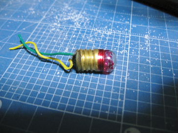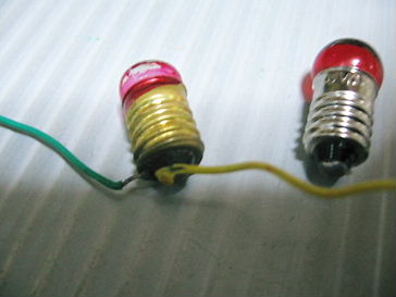 画面向かって、左の写真は、オリジナルの豆電球を取り外したところです。赤い色が剥げて、元の透明の色が出てきています。丁度、ストックで、赤色の豆電球があったので、それと入れ替えます。直接、配線がハンダで付けてあるので、同じ様にハンダで取り付けます。