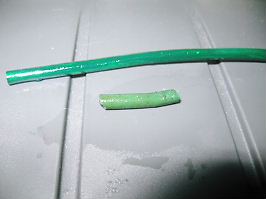 ホースが、ちぎれて無かったので、ホースを作ります。幸いにも、洗濯機の内部に、オリジナルのホースが(上部右写真の断片の小さなホース)、残っていたので、色は判りました。