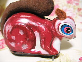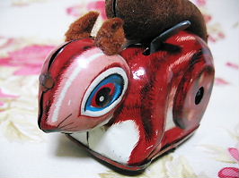 リスもブリキで出来ていて、色彩も良い感じなっています。ちなみに、耳は、無くなっていたので、フェルトの布を代用して付けています。オリジナルの耳は、ブリキで出来ていたかもしれませんね。